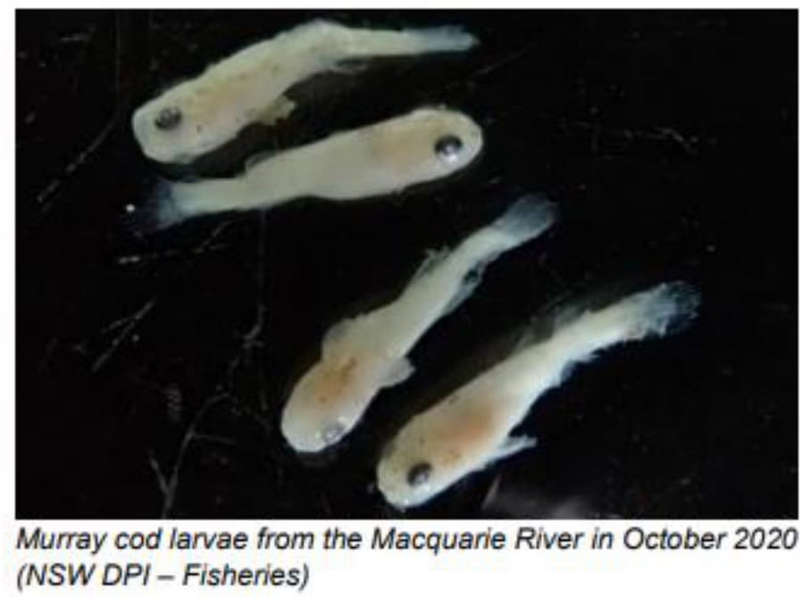 Despite a hiccup with the cold water pollution control curtain in Burrendong which sent chilly 12 degree water down the river, NSW DPI – Fisheries detected Murray cod larvae in the Trangie area in mid-October. Based on larval ages, hatching of eggs began at the start of October.