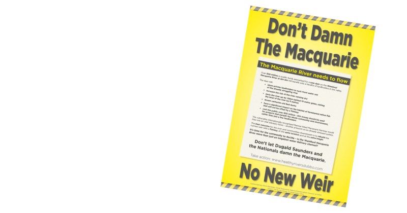 Healthy Rivers Dubbo has launched a community powered campaign featuring television, radio and newspaper advertisements to highlight concerns about plans to dam the Wambuul Macquarie River at Gin Gin, between Narromine and Warren.